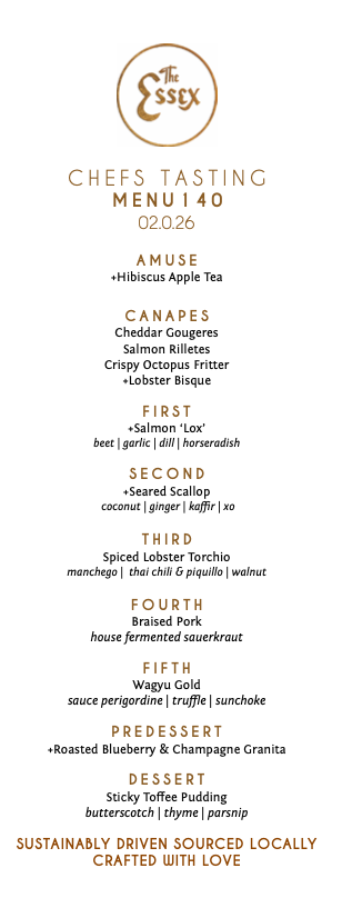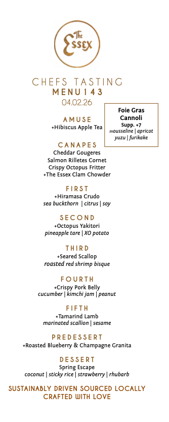 Here at The Essex, We have been offering tasting menus for over 7 years as our signature ‘calling card’. You will eat the same amount regardless of ordering prix fixe or tasting menu, you will just experience smaller and more varied portions meant to entice and engage you while limiting Palate fatigue (the scientific backdrop of flavor sensations acclimating after the third or 4th bite of the same dish. Regardless of how good something tastes you will invariably be on the downswing of the bell curve once you reach this point. A tasting menu is designed to keep you at the pinnacle of palate confusion and excitement!). We genuinely believe in earning our guests trust, and welcoming you in the experience new products and flavors straight from the mind of our chef owner Colt Taylor for a stress free, decision free dining experience. We will do our best to work within the confines of allergies, however we are not always able to pivot in the moment. The tasting menu changes daily so be sure to call ahead if you plan on partaking for the most up to date information! We look forward to welcoming you in to ‘The Experience’.